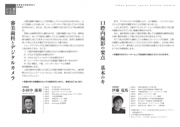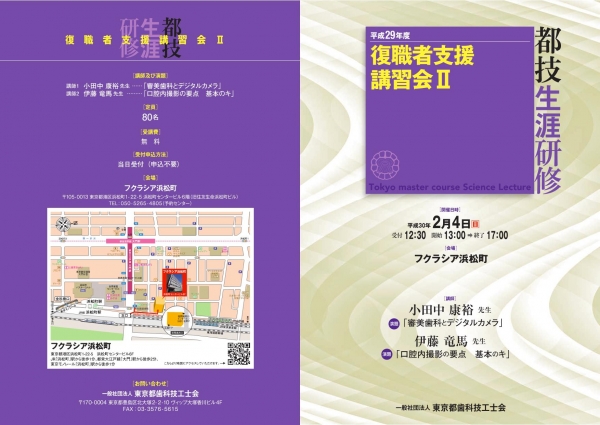 2018/02/04 都技 学術催事情報 復職支援講習会Ⅱ 平成29年度 復職支援講習会Ⅱ 平成29年度 東京都歯科技工士会では、会員・非会員問わず無料で受講できる学術催事を行っております。※会員は優先的に受講することができます。【開催日時】2018年2月4日(日)13:00〜17:00 受付12:30【講師…演題】小田中康裕先生・・・「審美歯科とデジタルカメラ」伊藤 竜馬先生・・・「口腔内撮影の要点 基本のキ」【定員】80名【受講費】無料【お申し込み方法】当日受付(申込不要)【会場】フクラシア浜松町 前のページへ戻る