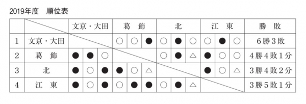 文京・大田の優勝は決定したものの、この日の第1試合で葛飾が勝ち、第2試合で文京・大田が負けると葛飾も同時優勝となります。
