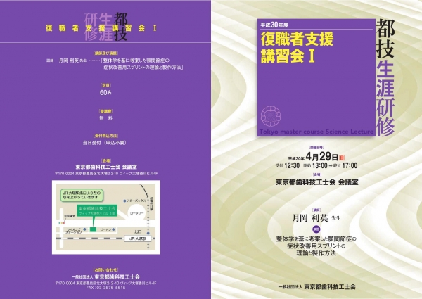 2018/04/29 都技 学術催事情報 復職者支援講習会Ⅰ 平成30年度 復職者支援講習会Ⅰ 平成30年度 東京都歯科技工士会では、会員・非会員問わず無料で受講できる学術催事を行っております。※会員は優先的に受講することができます。【開催日時】2018年4月29日(日) 受付12:30 開始13:00→ 終了17:00【講師…演題】月岡 利英 先生・・・「整体学を基に考案した顎関節症の症状改善用スプリントの理論と製作法」【定員】60名【受講費】無料【お申し込み方法】当日受付(申込不要)【会場】東京都歯科技工士会 会議室 前のページへ戻る